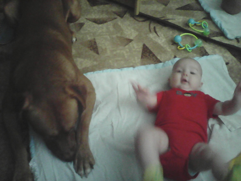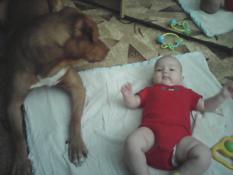 Решили приучать к полу, тк у нас дело в собаке. На кровати игрушки не трогает тк туда не пускают. Я переживала что на полу будет потом война за игрушки. Положили сына на пол, пес сделал пару кругов вокруг него, все обнюхал и улегся рядом, охранять!)))) я довольна началом, игрушки не трогал.