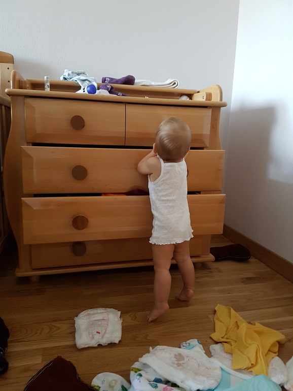 Ходит вдоль мебели, сама стоит, забирается на подиум (слазить не умеет), вытряхивает содержимое шкафов...