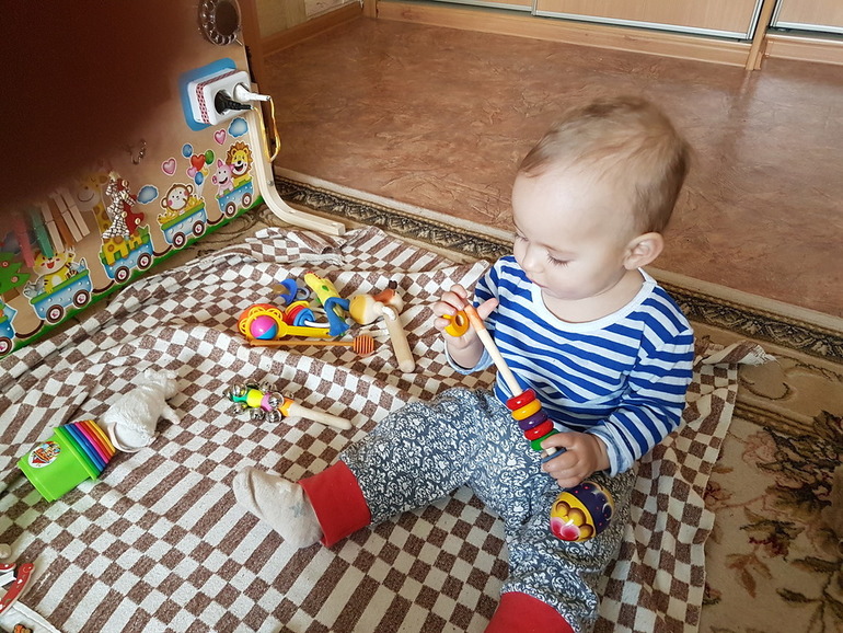 Ещё стала собирать пирамидки. Пластиковую с большими кольцами, деревянную (Икеа) с маленькими отверстиями, нанизывает счетные бусины на палочку. Рука ещё не так точна и ловка ,поэтому я помогаю - немного иду навстречу стержнем. Видно, что успех её радует.