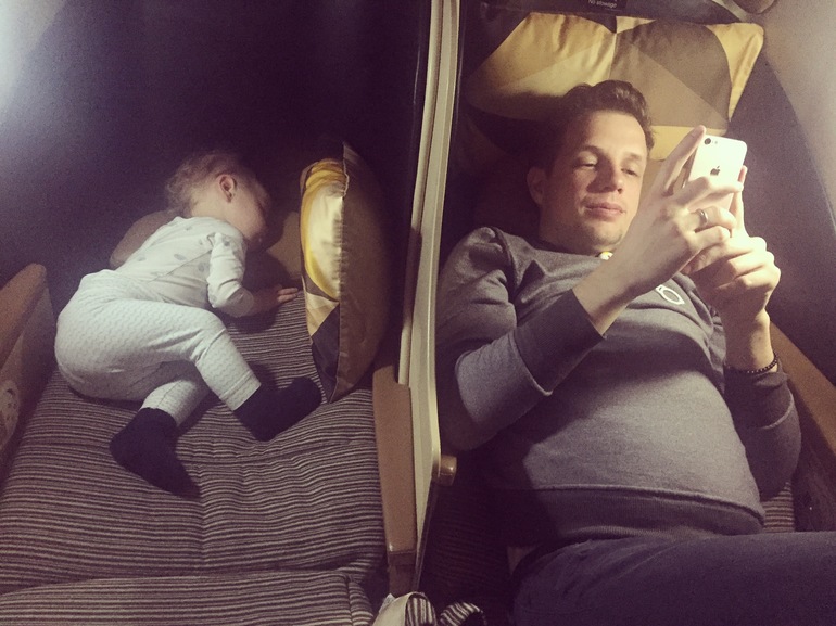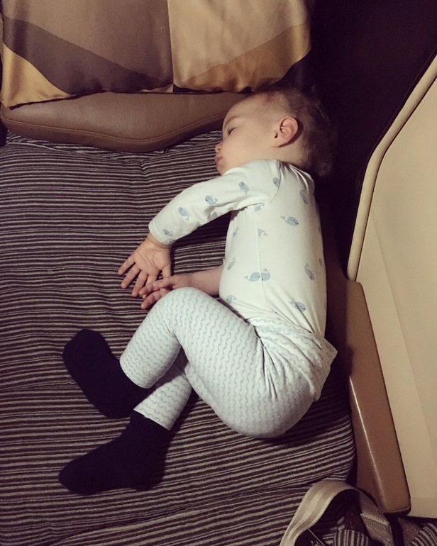 В Абу-Даби мы летели бизнесом, но не было люльки для малыша. Поэтому Вадюшка отвоевал у меня большую часть кресла и развалился так, как ему хочется ((: А я в скрюченном состоянии то спала, то просыпалась... в итоге села у его ног, заказала завтрак и смотрела фильм, так "спать" уже не было сил... зато мальчишки мои выспались ((: