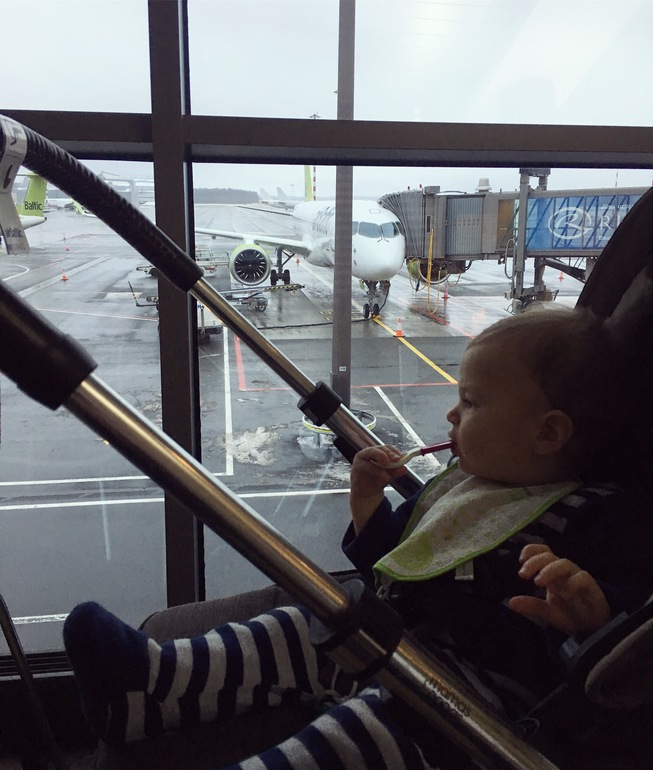 В аэропорту покормили малыша пюрешкой, запили соком и на взлет благополучно уснули.
