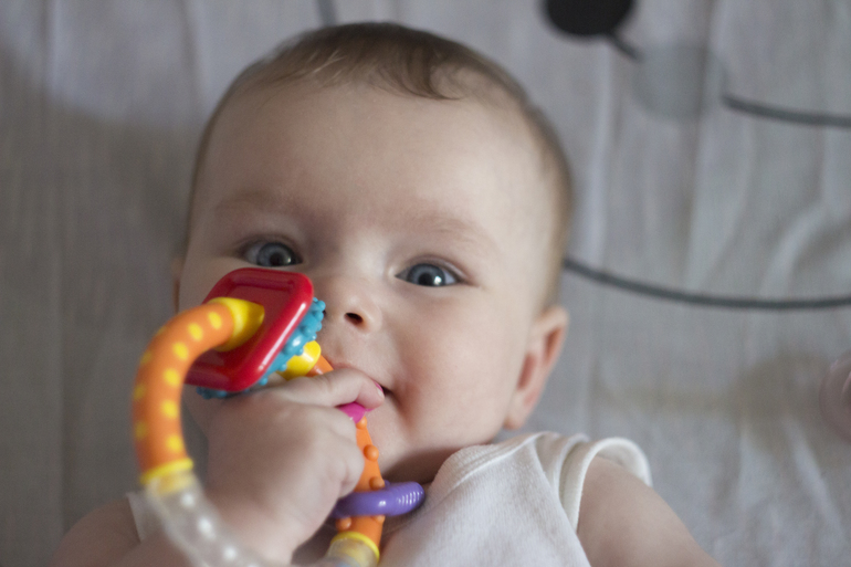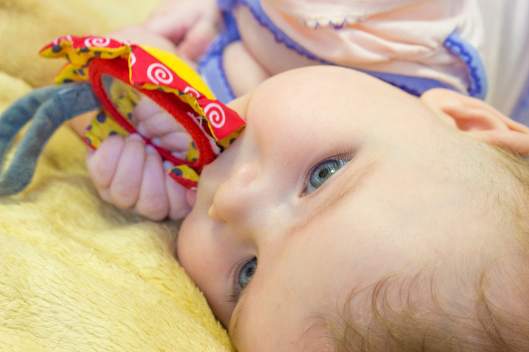 Кардинально за это время ничего не поменялось. Юна научилась хорошо переворачиваться с живота на спину и теперь катается во все стороны и во всех направлениях. Понимает, каким боком нужно засовывать в рот пустышку и вполне успешно это делает. Я начала понемногу давать ей воду, ибо жара стоит просто неимоверная и мне стало казаться, что грудного молока не всегда достаточно, чтоб обеспечить ее потребность в жидкости.