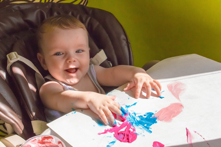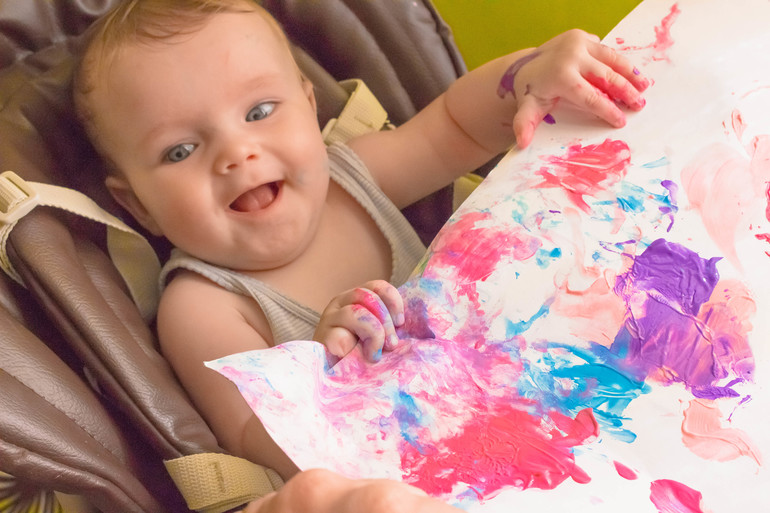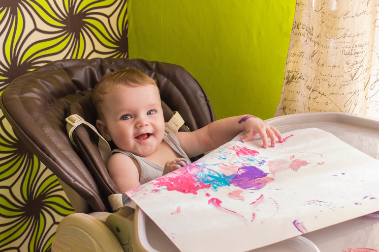 Мы переместились на кухню. Я достала плотную акварельную бумагу, открыла баночки и вручила это все дочке. Судя по улыбке, ей очень понравилось размазывать краски по листу. И не смотря на то, что мне после этого занятия пришлось стирать одежду (свою в том числе), отмывать пол кухни и чистить фотоаппарат, было здорово! Думаю, обязательно повторим на днях.