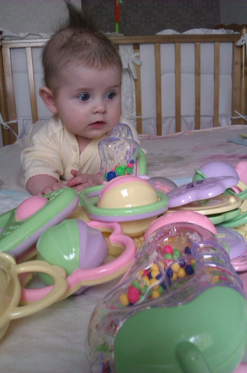 Есть у нее любимая игрушка, книжечка для купания , она на ней то и отрывается. Грызет с такой жадностью, слюни во все стороны) Нашла свои ножки, теперь при смене подгузника они, непослушные, тоже в ротике)) Капризничать стала мнооооого, с чем связано не знаю, может этап развития такой.