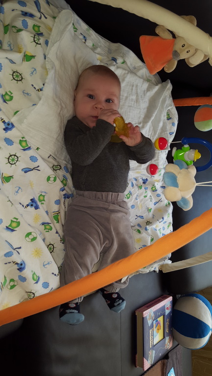 Любит когда его целуют в шейку и пузик. Общительный наш мальчик. Начал немножко хохотать,но пока его все еще тяжело расмешить.