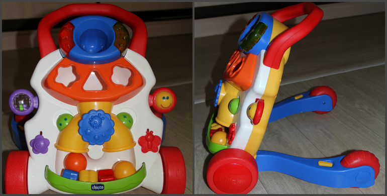 2. Игровой центр-ходунки. Забавная веселая музыка, совсем не надоедает. Сын уже сам подползает к ним, встает и идет с ними и играет музыка. Помимо возможности ходить с ними, есть следующие функции: слева шарик дергать и в нем маленькие шарики стучат, справа шарик со смайлом - дернешь и играет музыка; сверху возле ручки две мигающих лампочки во время музыки; бросать шарики в голубое круглое отверстие: бросать фигруки в оранжевые отверстия; ниже синий круг можно вертеть; слева цветочек и справа бабочка - поднимать и опускать, они трещат в это время.