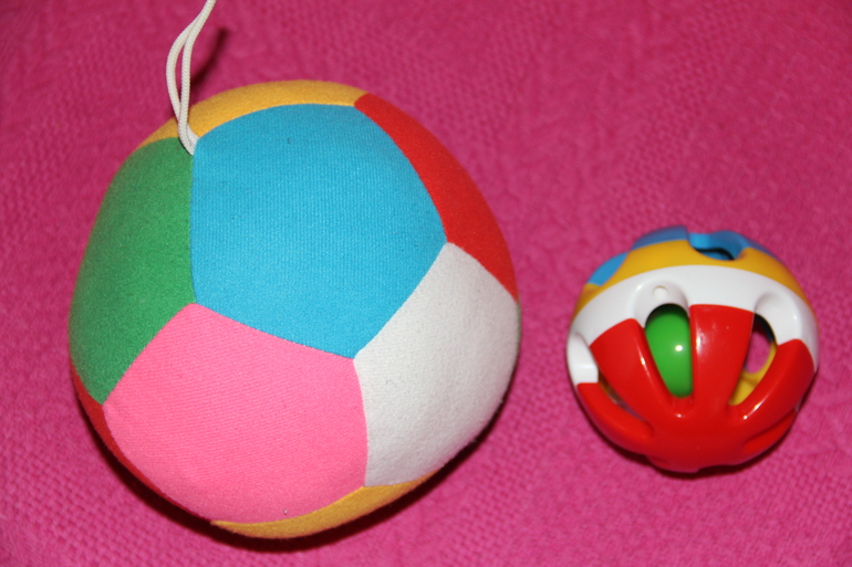 9. Мячики. Пытается грызть. Трясет в руках. Швыряет, ползет за ними. Если я с ним играю, то подкидываю, катаю ему.