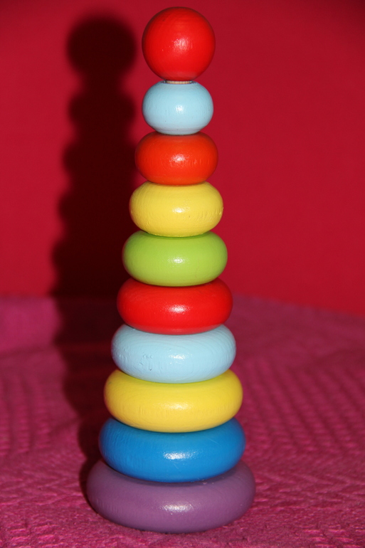 11. Пирамидка деревянная. Обычно я колечки складываю на полу и сын с постоянным упорством рушит их. И меня и его это забавляет)) Платон еще любит их погрызть. Колечки поменьше я от него тогда прячу, чтобы не проглотил, и палку, чтобы не поранился.