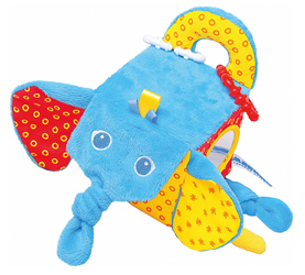 Используем с 1 месяца. Подарили. Мягкий кубик в виде слона. Много узелков, кармашек, пластиковые колечки, кругляш из твердого пластика, уши хрустят. Уже в 1 месяц рассматривал внимательно его. Потом начал хватать руками и мусолить узелки, грызть колечки. Правда кругляш не понравился, равнодушен к нему.