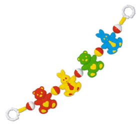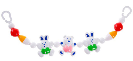 Используем почти с самого рождения, вешали в автолюльку, электр.качели, на игровой коврик. Все из пластика, ярких цветов, простых форм и звенят. Сначала смотрел, потом стал случайно задевать их, потом осознанно трогал, лупил по ним, запихивал в рот. Сейчас режутся зубы, очень удобно грызть уши на этих игрушках