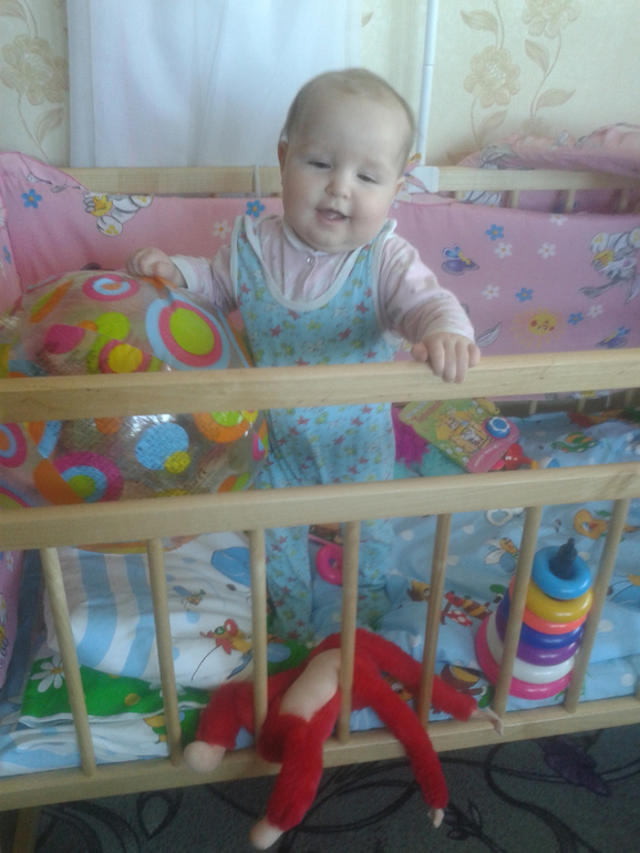 Что умеет: сидит ровно, сидя тянется за игрушками не падает. Когда сажу в кроватку хватается за бортики и встаёт, стоит не долго я не позволяю т.к. отпускает руки и падает. Стараюсь больше держать на полу, пусть ползает.