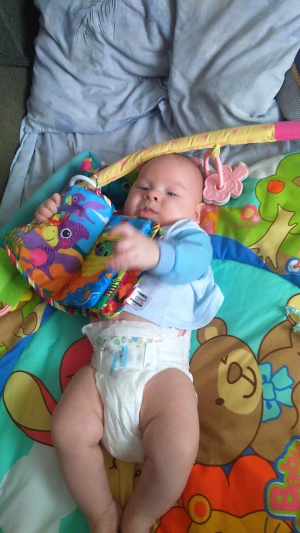 С удовольствием трогает и разглядывает игрушки.Кажется пора нам покупать развивающий коврик. А ещё он лёжа на спине приподнимает попу и ногами отталкивается, как-будто подпрыгивает. Начали пробовать соки и пюрешки яблоко и груша. Начали с нескольких капель и с одной ложечки. Даю не каждый день, т.к молока много. Вес на сегодня 6500. (+600 норма)
