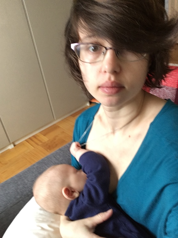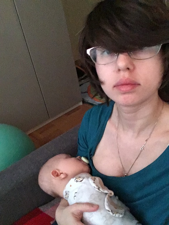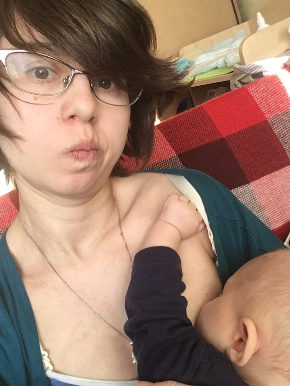 16:07 Есть-есть-есть, по-другому не успокоить(( Не люблю перерывы в еде меньше 2,5 часов, но кто ж спрашивает мать. И, конечно, после всех обычных выкрутасов мы оба уделаны молоком. При этом ребёнок всё равно недоволен. Начинаю борьбу за хорошее настроение.