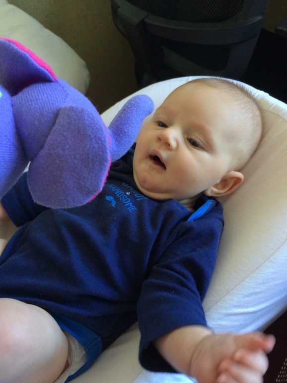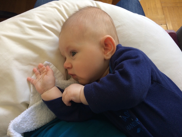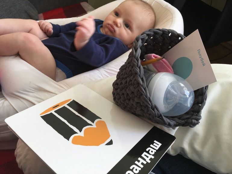 10:55 Пошли валандаться в наше «гнездо». Надо скоротать время до еды. Младенец общается со слоном, я читаю что-нибудь, периодически рассказывая ему рандомные факты про слона, показываю какие-то ещё предметы. Через минут 20 ему становится скучно, поэтому я ношу его по квартире лицом от себя и показываю-рассказываю, прикладываю ногами-руками к разным текстурам. Хотя и это вскоре надоедает.