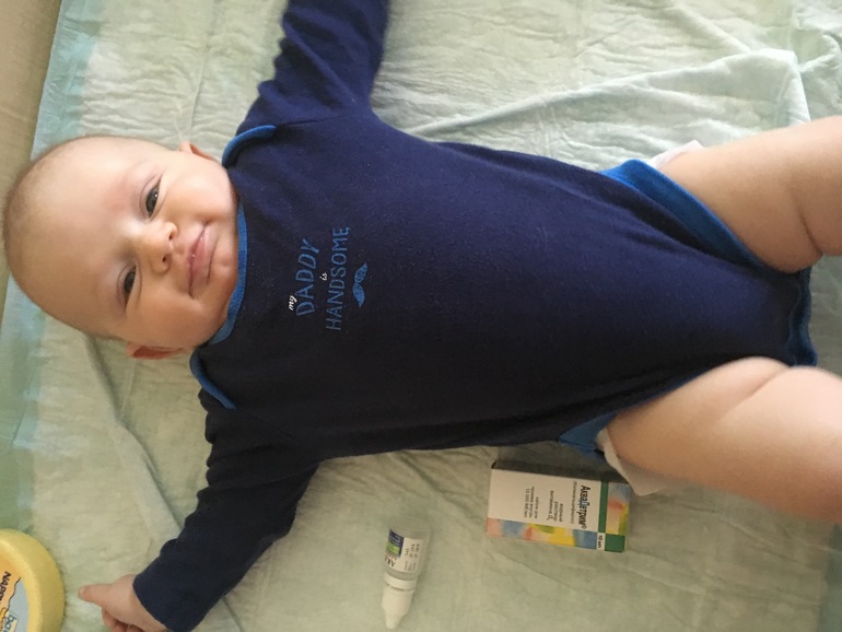 Но теперь точно уж вставать, а то ребёнку надоело валяться, о чём он не стесняется сообщить. Сначала у нас процедуры для Мишки: переодеваемся-одеваемся, витамин Д по всему лицу и аквамарис. В общем-то и хватит с него.