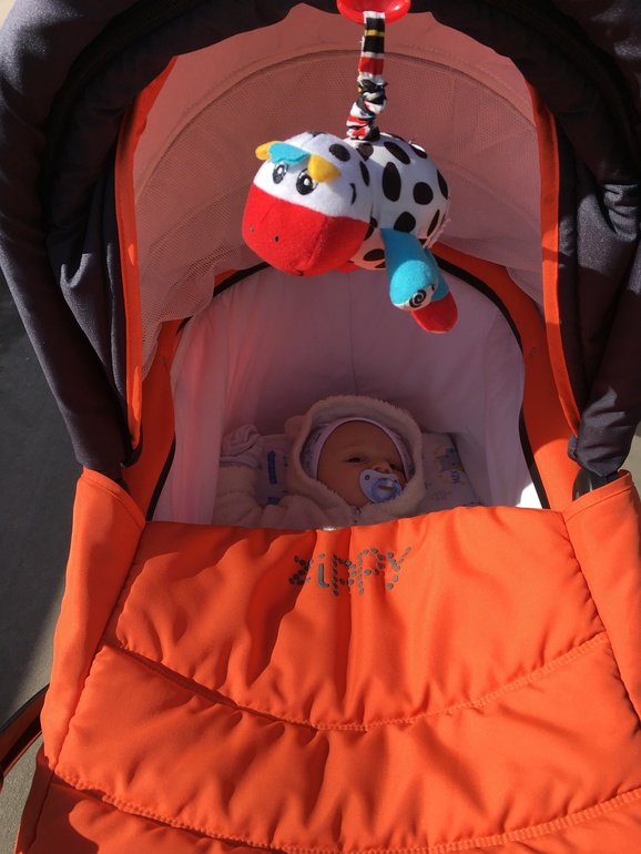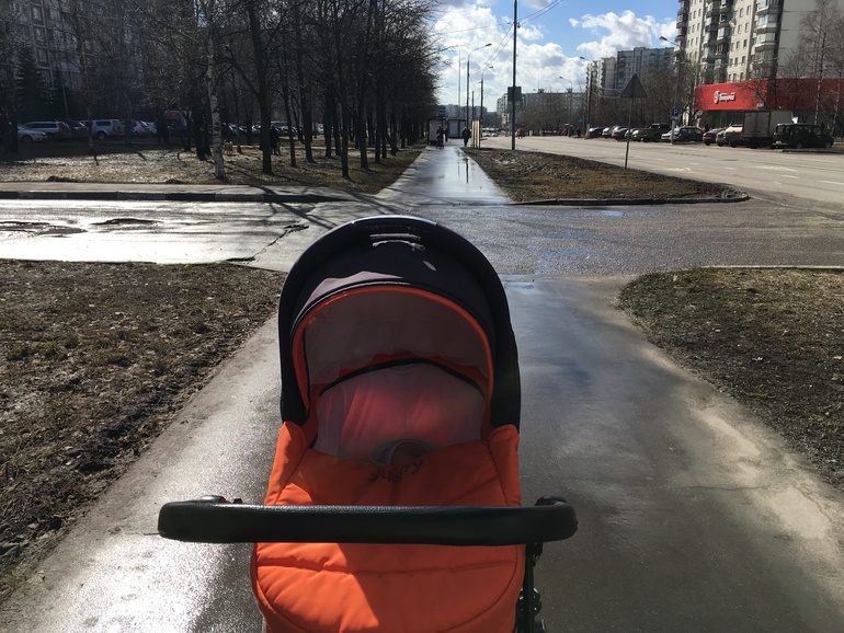 12:06 Выкатываемся из дома, Миша уже заснул. ВБ прям чётко 1,5 часа опять. Но на прогулке сон опять рванный. Поспал 35 минут, потом 20 минут поглазел, ещё 20 поспал, ещё 10 минут поглазел. Ну и, конечно, на подходе к дому решил поспать. Я такое не люблю, потому что из коляски его не достать - проснётся, в одежде вроде как жарко в помещении. Короче, это тот случай, когда надо принимать решения, фуфуфу. Но зато погода на улице отличная, солнышко. Прошлись по району кружочек (в лес пока соваться не стоит), зашли в магаз.