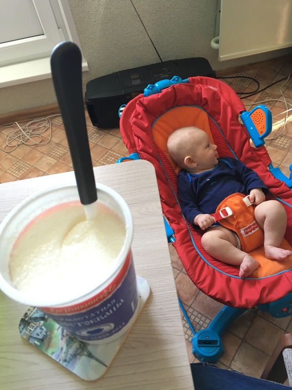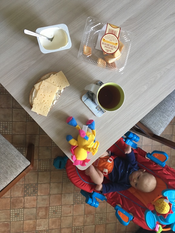 8:45 Ура, завтрак для меня. Мишка тусит в качелях, иногда с музыкой, иногда просто сам раскачивается. Ногами дрыгает всегда как угорелый. Недавно начал активно болтать с колонкой слева, улыбается ей. Но сегодня колонке не перепало, зато пообщался со львом. Да, завтракаю я теперь со львом в одной руке.
