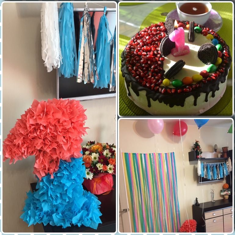 Подготовку к нашему юбилейчику я начала задолго до др. Сшила флажки из старых пелёнок, сделала фильм, распечатала фото каждого месяца, с мужем сделали цифру, заказала украшения с алиэкспресс, и сама сделала торт)) ещё ходили на фотосессию незадолго до др, пара фото уже есть, по моему так просто очень красивые.