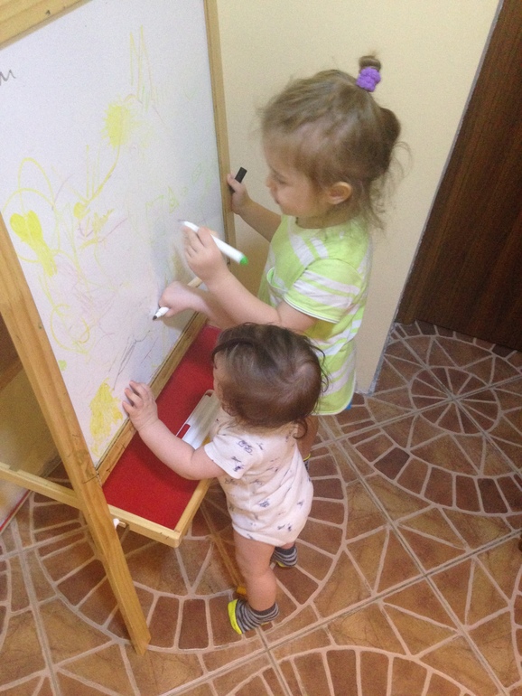 Отчёты по месяцамДуша радуется! Лето скоро! Вестунька в свои 9 месяцев пошла. Сейчас уже чаще ходит, чем ползает. Забирается везде и всюду, только и успевай ловить. Настя ее любит, чувствует себя старшей и смотрит за ней. Вообще Веста у нас самая залюбленная улыбашка. А еще! Она рисует, представляете?!