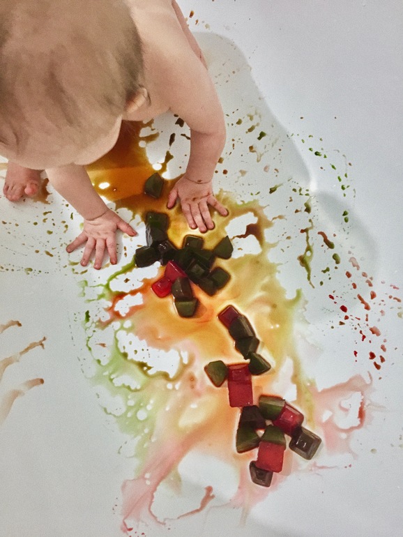 Решили мы немного поиграться в ванне. Я заранее заморозила кубики льда с водой, покрашенной пищевым красителем. Было у меня всего два цвета: красный и зелёный.
