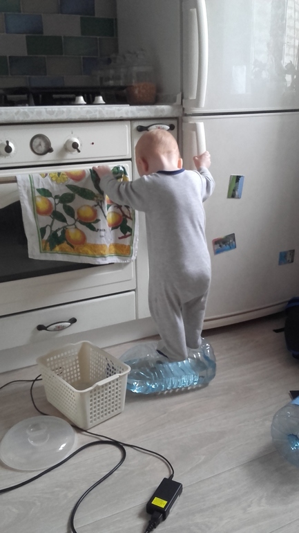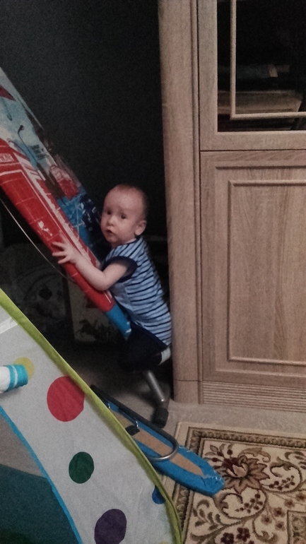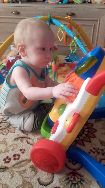 Ходит практически все время, редко ползает. Еще с дивана и кровати нашей сползать научился. А так стал более требовательным, хитрым. Далее под кат.