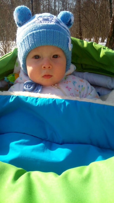 Любит гулять в эргорюкзаке с мамой по лесу.С интересом смотрит на птичек,белочек,детей,машины.