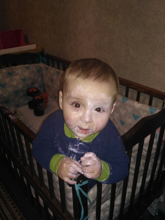 А это Богдан стащил крем с пеленальника и у мамы было 5 минут тишины,заметив неладное пришла и увидела фантомаса)