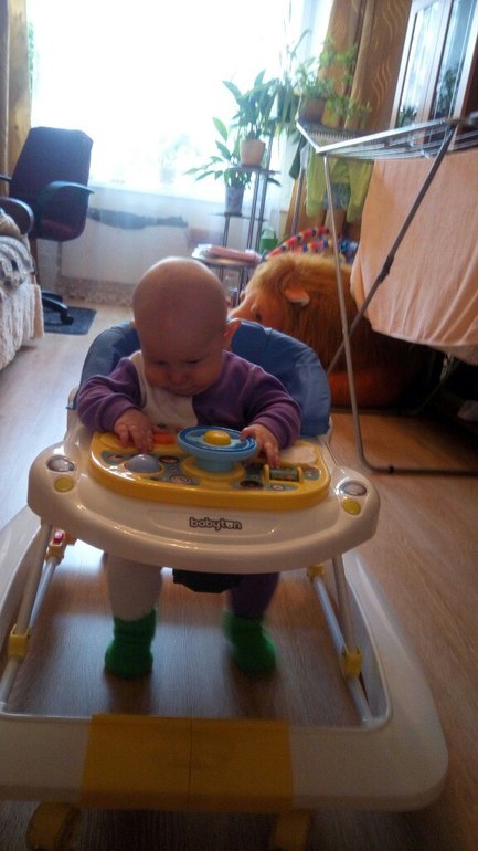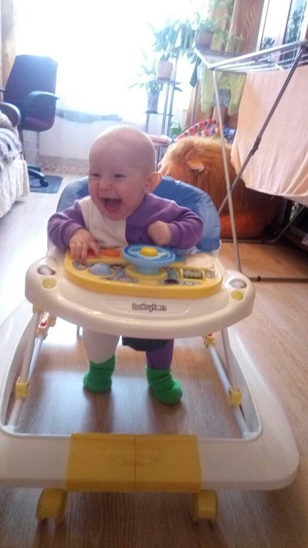 Спасибо:)Сидит с поддержкой,если отпустить- заваливается.А в ходунках он как- бы в стоячем положении находится.Его любимое положение:)))Будет орать,канючить,но добьётся того,чтобы его держали стоя,а он будет играть,нагинаться за игрушками,подпрыгивать.Лежать и ползать совсем не интересно ему:(
