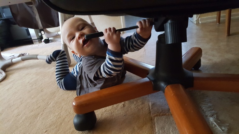 Ползанье и попытки встать во всю,запросто стоит у опоры(мамы,не рано ли?). Болтаем,отчетливо получается баба,ма.