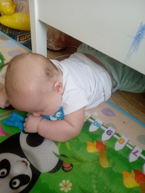 Очень любит жевать уши жирафа Софи, прям скрип стоит на всю квартиру. Научился ползать задом, это очень смешно смотрится. В общем, растем и считаем дни до поездки на море