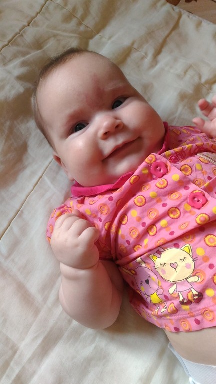 Переворачиваться стало лень. Но теперь лежа на животе, вытягивает руки, пытается подняться. Игрушки теперь может сама брать. Стала дольше спать, раньше только по 30 минут спала, теперь и длинные сны дома бывают. Всегда себя убаюкивает голосом. В голос очень забавно хохочет )). Стала играть в тряпочки, случайно это обнаружила, рядом лежала пеленка, она ее в рот потянула, теперь если ей дать что-то тряпочное, то она в руках теребит и врот пытается засунуть.