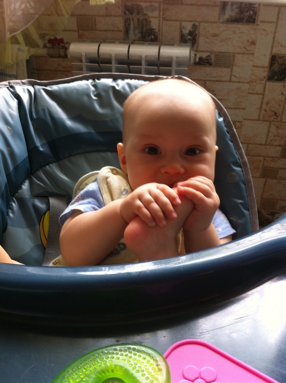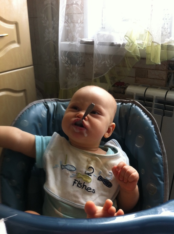 Питание. Кушаем грудное молочко по требованию. Из прикорма, утром кашки безмолочные, иногда туда добавляю смесь и ложечку сливочного масла. На полдник фрукты, грамм 50, на обед овощи с мясом. Планирую вводить творог и кефир. Жует кусочки, откусывает яблоко и банан и мусолит во рту, потом глотает, так что думаю можно уже готовить самой и разминать вилкой. Аппетит не особо хороший, больше 100 грамм не ест.