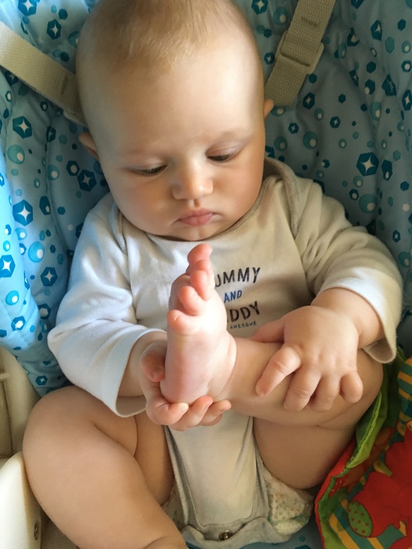 Начал засовывать в рот не только руки, но и ноги. Вообще пытается тащить в рот много чего, но лучше всего заходят наши руки: грызёт их с небывалым остервенением. Начал проявлять интерес к еде. Самый первый продукт, который его заинтересовал - сыр. Мы ему регулярно давали нюхать всякую еду (не спрашивайте, зачем), но он был индифферентен. А тут Максим поднёс ему к лицу сыр и он как кобра бросился, Максим еле успел руку отдёрнуть))) Ну и с тех пор, когда он сидит у меня на коленях за едой (а ем я бОльшую часть времени с ним на руках), он жадно провожает каждый кусочек, аж шею сворачивает. Крайне сложно стало есть, в общем. Ну терпим ещё месяцок.