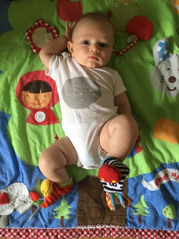 Игрушки берёт руками уже более уверено, хотя координация, конечно так себе: то в лоб засветит, то в глаз, то по уху. Сам тянется не всегда сразу, иногда нужно протянуть ему игруху и немного подождать, пока он среагирует. Ну и наконец-то он начал тянуться за игрухами вверх: в его шезлонге над ним зеркальце и всякие разноцветные фигурки и вот он тянется изо всех сил, чтобы их потрогать. Может быть попробую ещё раз в развивающий коврик его засунуть, а то он раньше не умел, видимо, тянуться, вот и не нравилось ему там.
