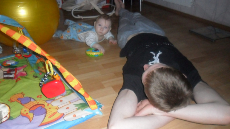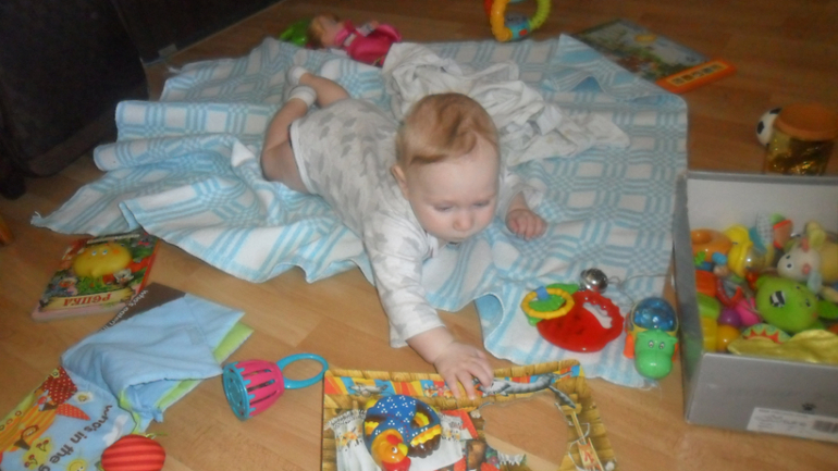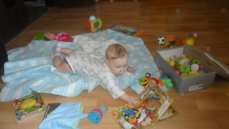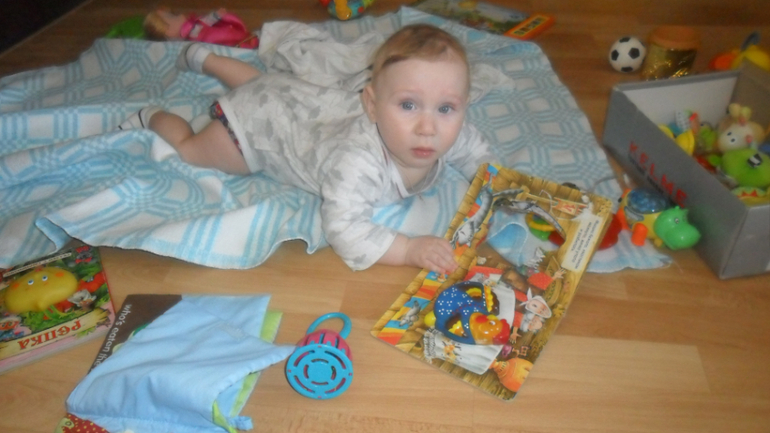 Пополз по-пластунски. Хоть что-то в плане физ. активности. Несмотря на ежедневные занятия на фитболе, гимнастику и массаж, жизнь на полу с 4 месяцев, ранних по освоению умелок маму и папу, Петя все делает поздно и ленится.