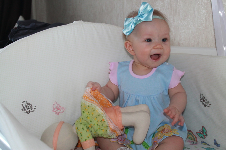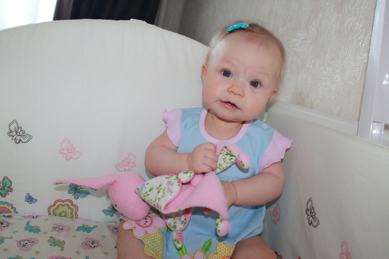 Отчёты по месяцамИ вот нам уже 7 месяцев....По сравнению с нашими сверстниками нам похвастаться особо нечем...Садится Вероника еще сама не умеет, если посадить спинку держит ровно, но заваливается на бок, ползает как лягушка (довольно быстро) несколько дней назад научилась становится на карачки и раскачиваться...Лежа в кроватке хватается за бортик и встает на четвереньки, поэтому бортик теперь обязательно поднимаю.Зубов так и нет. В шесть месяцев переболела розеолой, температура держалась 3 дня 39,3...Кушает Ника уже много: кашки Хайнц (гречка, рис, пшеница, кукуруза), пюре овощные и фруктовые, картошку, суп с мясом, творожок, ну и грудь (это вообще отдельная тема)...Проблема с питьем, бутылку вообще не признает, совсем немножко пьет из поильника Авент с силиконовым носиком. Нужно ли настаивать? Предлагаю несколько раз в день сок или воду, но делает один или два глотка, а иногда просто жует носик поильника....