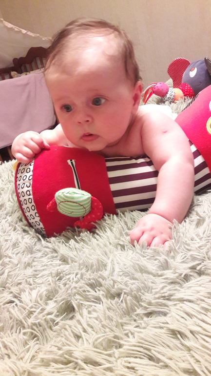 5.Купили мягкий валик-игрушку кладем на пол животиком на него,она становится на четверенький и спомощью него учится ползать,думаю скоро у нее это получится и тогда придется привязывать ее за ногу к кровати(шутка).