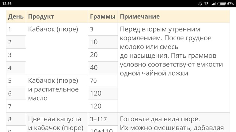 И решили мы начать ее прикармливать. Т.к. вес до этого она набирала хорошо, решили начать с овощей, а именно с кабачка. Пюрешку я сделала сама, на вкус конечно не деликатес, но вполне сносно, думпю из банки не особо то оно чем-то отличается. За основу взяла таблицк рекомендаций ВОЗ. Кушаем мы мягко говоря без восторга и за раз небольше 20 граммов. Она конечно не истирит и не плюется, не хочет открывать рот, не воспринимает это как еду, для нее это игра.