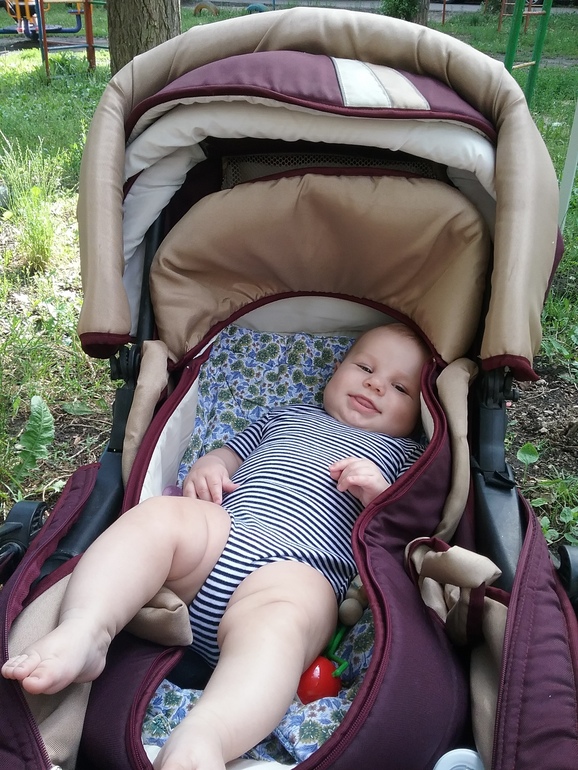 .сначала стелила большой плед,но он его подминает под себя,да и на маленькой клеенке на месте не лежит,весь плед описенный (впрочем как и все диваны,смеёмся , диваны почти новые через год на выброс).теперь ползает по голову линолеуму.стал проситься на ручки,будет рыдать пока не возьму.также начались проблемы со сном.раньше засыпал без проблем,но собака сгрызла его соску,а другую он сосать отказался,покупала штук 15 разных,не сосёт. Я думаю поэтому ему тяжелей засыпать,не то,чтобы это была большая проблема,но приходится теперь его укачивать, правда недолго,от 5 до 10 минут.ЕДА.9 утра 210 смесь (перешли на двойку),12.30 овощи+мясо кролика (овощи ввела все,мясо только вторую неделю),3 банки овощей и 1 банка кролика,получается аж 320 мл,о ужас.мясо отдельно не ест,только если перемешать. 16.00 210 смесь,19.30 210 смесь,23.00 210 каша из бутылки.пробовала давать утром и с ложки,но ему не нравится,поэтому папа сделал просто гигантскую дырку в соске и наш малыш поглощает кашу на ночь.ввела гречку и кукурузную.также давала черешню(3 штуки), персик(четверть ссосал) и малину.малина ему не понравилась.Пытаюсь отказаться от памперсов по максимуму ,перестала одевать на ночь,теперь только на прогулку.ну и фото