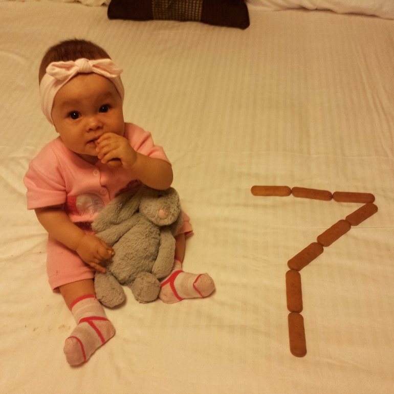Отчёты по месяцамНу вот перевалило нам за полгода)вес 7 кг,рост 65 см)все прививки сделаны.последняя вакцинация АКДС+гепатит+полиомиелит(не знаю как правильно пишется это нереально трудное слово))))прошла не очень гладко,доча капризничала 3 дня и 3 дня держалась температура от 37.7 доходя до 38.8.спасли свечи Цефекон.из умелок-ползаем хорошо и уверенно,сидим также как и ползаем,встает рядом с опорой.имеем два нижних зуба,лезут верхние,поэтому временами истерим)кушаем пюрешки овощные и фруктовые,кашки и печенюхи)смесь Симилак по 150 мл.и мы теперь путешествуем вместе с нашим папой)сейчас в Сингапуре.было 3 перелета,самый долгий 9 часов.все прошло хорошо,в основном доча спала и кушала)аклиматизация тоже прошла быстро и без проблем где-то за пару дней)так что растем и хорошеем)))все вместе:папа,мама и доча))) позже напишу подробнее пост про перелет и расскажу о Сингапуре)всем лучики добра)