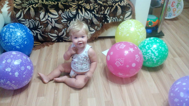 а это было утром, когда Соня проснулась, шары были с вечера надуты, пока дети спали, мы с мужем надували шарики