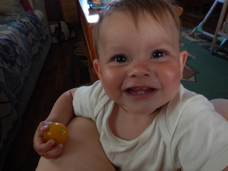 Повылезали зубы, 2 сверху и два снизу, итого на сегодня 6 зубов и еще один сверху на подходе, думаю, к году будет 8 зубов как и положено.