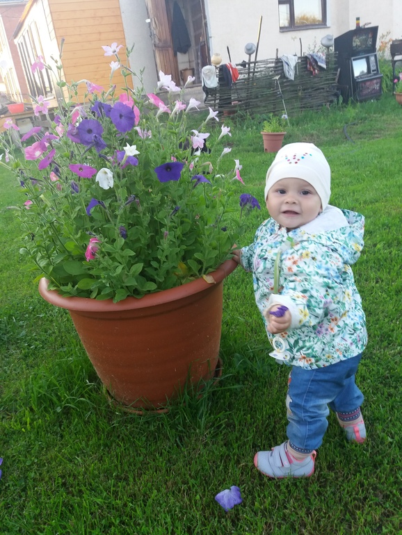 за этот месяц произошел существенный скачек, Лида стала копировать все наши действия, пытается одеть обувь на ноги, кепку на голову, трясёт присыпкой у попы) пытается подражать звукам, лает вслед за собакой, глядя на соседского мальчика, который уже ходит, практически перестала ползать, ходит по стеночке. Сама боится еще, вожжи тоже не признает. Любит ходить за ручку.