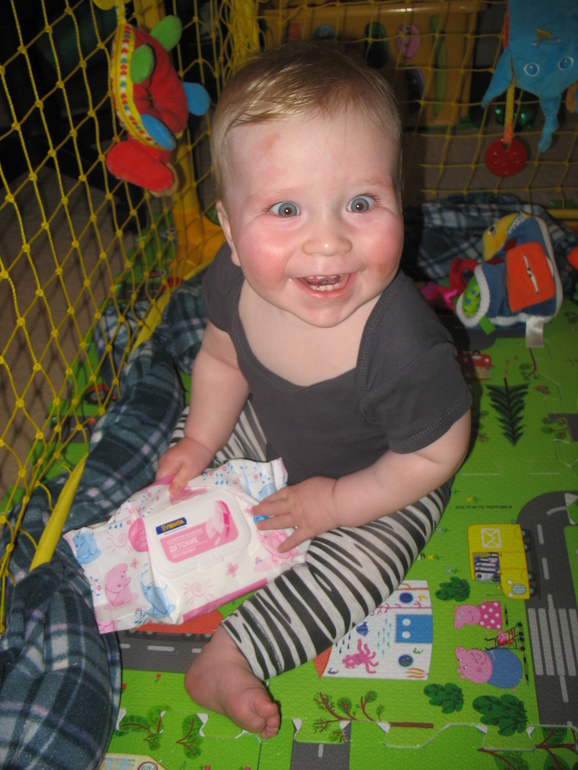 О хорошем. Недавно Максимка пошел с опорой. Купили ему каталку, гоняет с ней по квартире и визжит от радости )) За ручки пока не очень любит ходить. Шатается, болтается и в итоге просто начинает ползти.