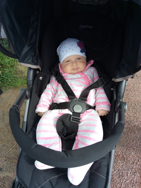 гуляем в люльке на пузе, опускаем козырек, через бортики смотрит вокруг, особенно любит на машины глазеть))