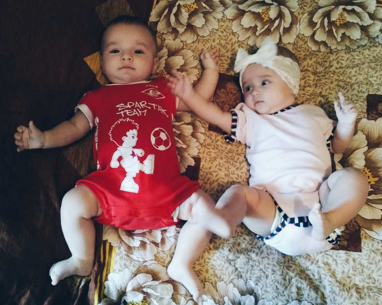 3 дня назад Валера сам перевернулся на бочок. Пытается это сделать снова периодически, но не особо получается. А попытки Киры начались месяц назад, теперь она поворачивается на оба бока, на второй бок у неё получилось завалиться тоже три дня назад.