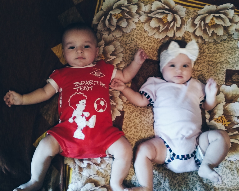 Лежа на животе голову держат, Кира уверенно и хорошо, Валера послабее, но все же старается очень. Причина моих страхов и расстройства. Уже давно бы записались на массаж, но теперь мы в другом городе, и назначение врача из Питера здесь не канают, нужно проходить невролога здесь, а запись только на 23 августа. Даже платно не записаться, по той же причине. Ну и по той, что зарплата у мужа, так же, как и первое детское пособие - только 10 сентября...