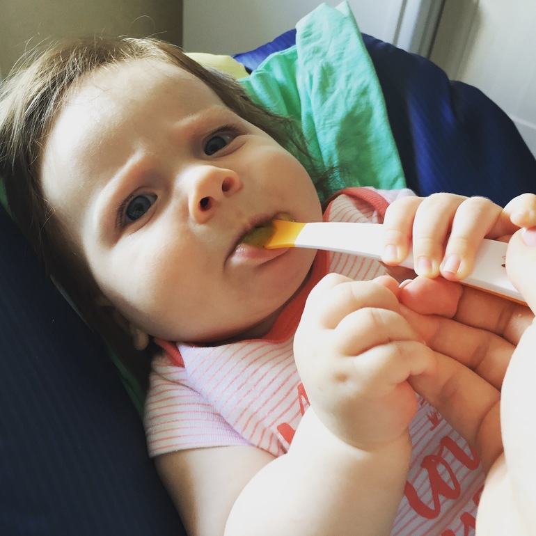 Не могла я больше смотреть, как дочь провожает взглядом каждую съеденную мною ложку) И сегодня дала ей первую ложку кабачка) Пошел на ура) Вырвала даже ложку из рук))Мне кажется, она готова съесть все что угодно)