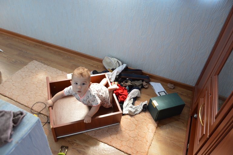 Помогает маме наводить порядки в шкафу на лоджии