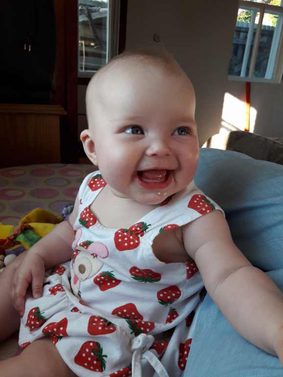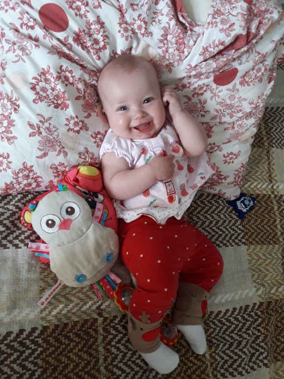 Уверенно стоит на четвереньках, долго раскачивается. Все ищет мои руки, чтобы встать попрыгать. Такой сейчас момент Ваньки-встаньки. Села, встала на четвереньки, покачалась, немного продвинулась вперед, села, легла, перевернулась. И так все быстро, ловко! Жду что скоро поползет!